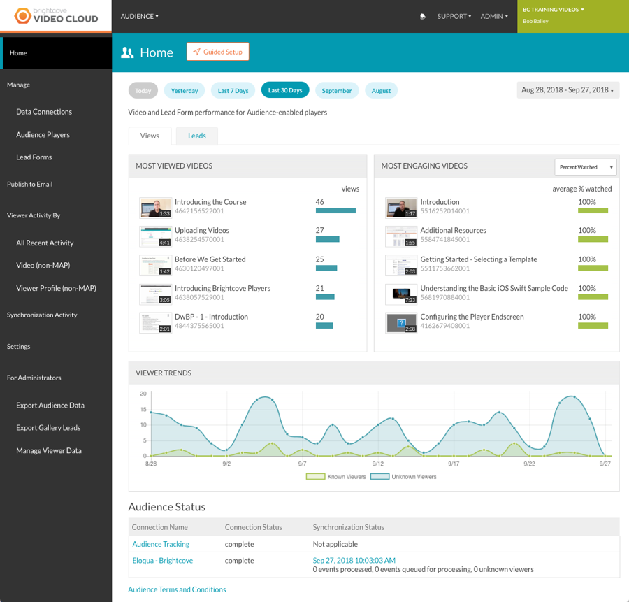Audience模塊用於跟踪在啟用Audience的Brightcove Player中查看的視頻的視頻參與數據。查看數據存儲在Video Cloud中,可以選擇同步到流行的營銷自動化平台,例如Eloqua,Marketo,HubSpot和Salesforce。
