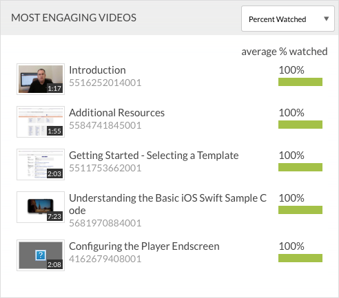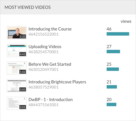 「最常觀看的影片」圖表顯示所選時段內已啟用受眾播放者的最多觀看影片。