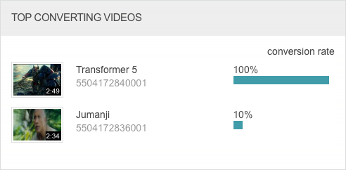 「熱門轉換視訊」圖表會顯示轉換率最高的視訊。轉換率的計算方法是將提交的潛在客戶表單數除以影片曝光次數除以。