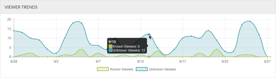 「檢視器趨勢」圖表會顯示所選期間內一段時間內的視訊檢視。會顯示來自已知和匿名檢視者的檢視次數。將鼠標懸停在圖形上將顯示實際數據點。