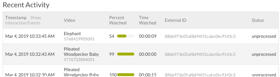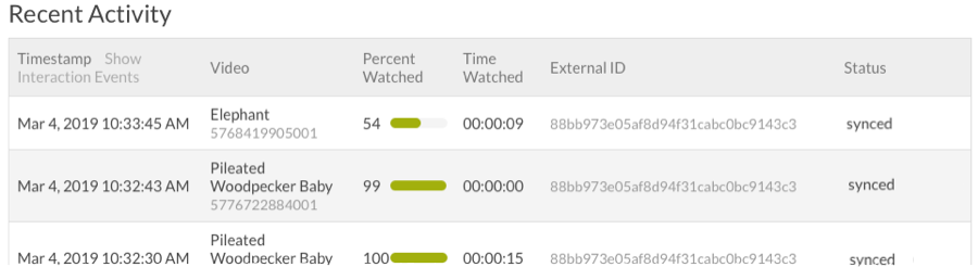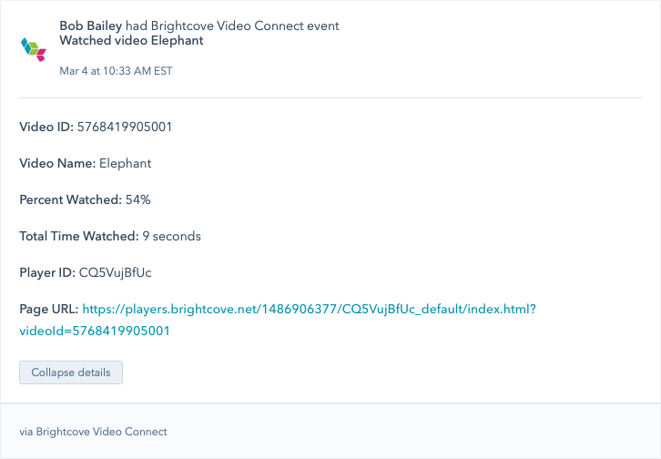 - 在活動日誌中,查找說明User_Name發生了Brightcove Video Connect事件。點擊顯示詳細資料查看視頻觀看事件的數據。
