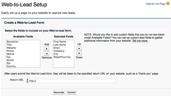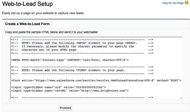 Salesforce 中的「網路對潛在客戶」功能可用來產生網站訪客的潛在客戶資訊。這些形式也可以顯示在布萊特灣玩家的內部。下面的步驟將創建一個簡單的表單來捕獲名字,姓氏,電子郵件地址,公司,城市和州/省。如需網路對商機功能的完整詳細資訊,請參閱 S alesforce 文件。