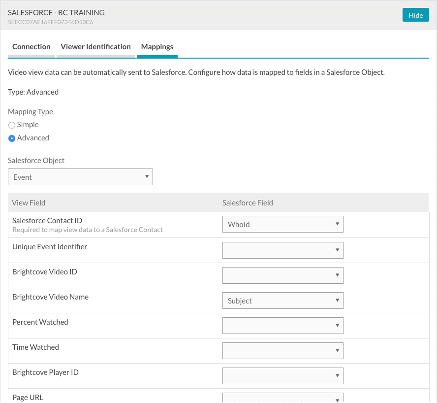 - 在裡面Salesforce對象下拉列表,選擇一個對像以將視頻數據映射到。