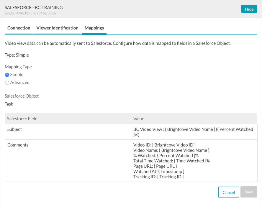 資料對應決定視訊資料如何對應至 Salesforce 物件中的欄位。依預設,整合將使用簡易對應來設定,該對應會將某些視訊資料對應至 Salesforce 中的工作物件。